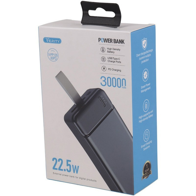 پاوربانک VERITY مدل PP135 با ظرفیت 30000 میلیآمپر ساعت، یک همراه قدرتمند برای دستگاههای هوشمند شماست. این پاوربانک با طراحی جمع و جور و ویژگیهای پیشرفته، به شما این امکان را میدهد تا در سفرها و مسافرتهای طولانی، با خیالی آسوده از دستگاههای خود استفاده کنید.