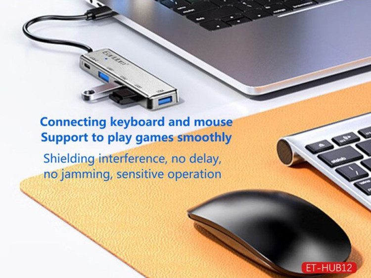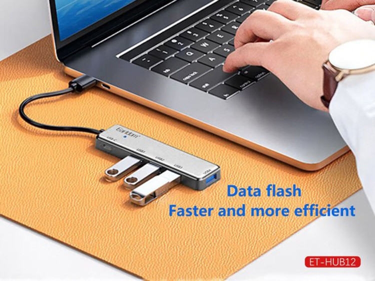 هاب یو اس بی ET-HUB12 از ABS و آلیاژ آلومنیوم به رنگ خاکستری ساخته شده و 4 درگاه از نوع USB 2.0 به همراه یک ورودی USB C در کناره های آن تعبیه شده است. این گجت قادر است داده ها را روی درگاه USB 2.0 با حداکثر سرعت 480 مگابیت بر ثانیه جابجا کند. این باعث می شود انتقال فایل های بزرگ کار بسیار لذت بخش برای شما باشد. در یک سوی دستگاه یک کابل با کانکتور تایپ A مقاوم از جنس PVC برای اتصال هاب به درگاه USB در نظر گرفته شده که طولی معادل 30 سانتی متر دارد. قرار گرفتن درگاه ها در کناره ها باعث شده اتصال لوازم جانبی بدون تداخل و به راحتی امکانپذیر باشد.