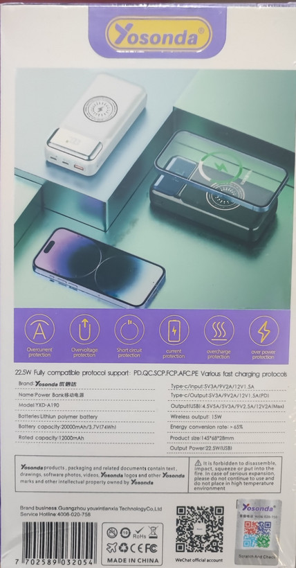 پاوربانک وایرلس YOSONDA A190 20000mAh مجهز به تکنولوژی شارژ سریع است که هم در پورت های ورودی و هم در پورت های خروجی این محصول قابل دسترس است. تکنولوژی جالب توجه دیگری که در این پاوربانک به کار رفته تکنولوژی وایرلس شارژ. یا شارژر بی سیم با توان ۱۵ وات است.